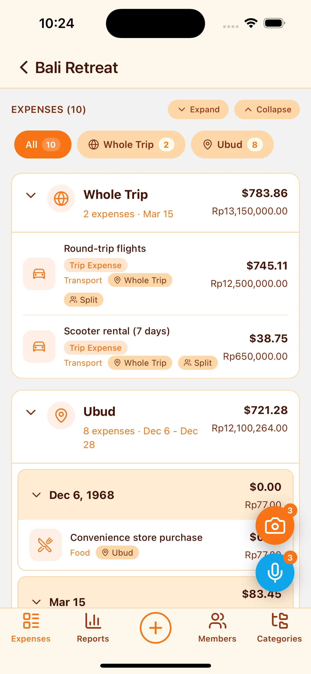 Simply speak your expense and let AI do the rest. "Lunch at Cafe Bali, 150,000 rupiah, food category." Works in any language with natural speech recognition. Perfect for logging expenses on the go.